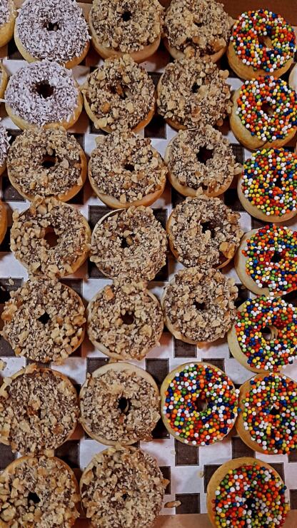 Mini donas con Topping Nuez, coco rallado, chispas de colores, chips de chocolate y solo chocolate .