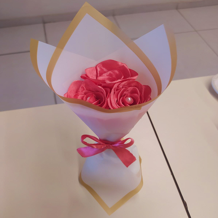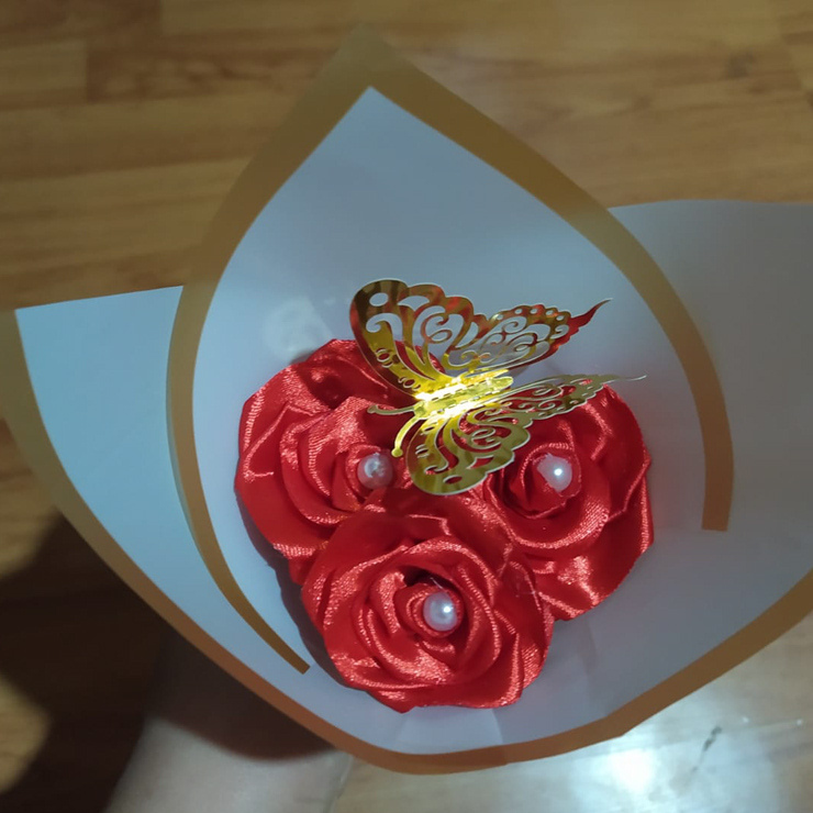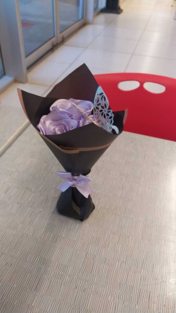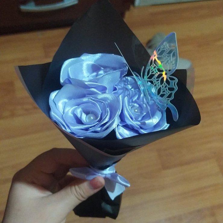 Mini ramo de 3 mini rosas eternas, talla s, hechas con cinta, envueltas en papel coreano, con un lazo en el centro. El color de las flores y el papel coreano depende meramente de la preferencia del cliente. Los colores de papel coreano disponibles son: blanco, negro y celeste. Detalles agregados cuentan con un valor extra, como perlas (50$c/u) y mariposas plateadas o doradas ($250 a $300 c/u según el tamaño). Para comenzar a trabajar en el pedido, se necesita el pago completo o un aporte de al menos el 60%. El producto se entregará en un lugar acordado por mí y el cliente, pero si el pago no se completa al 100% no se entregará el pedido y no se harán devoluciones.