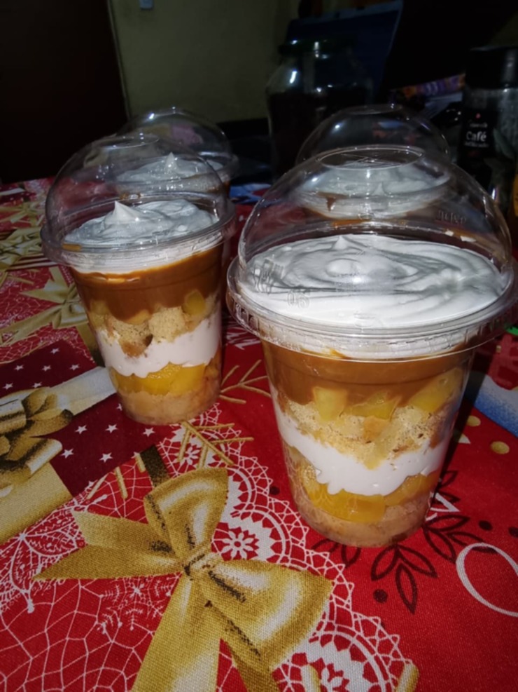 Contiene durazno, manjar, crema, y bizcocho de vainilla.